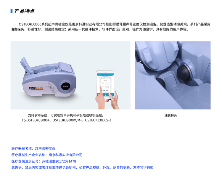 推荐的外接设备配置:OSTEOKJ3000M和OSTEOKJ3000M+型自带内置热敏打印机,需外接电脑系统(包括电脑、显示器、键盘、鼠标,可配彩色打印机)或外接平板电脑。需外接设备的型号,需正确连接并正确安装软件后,才能正常使用。